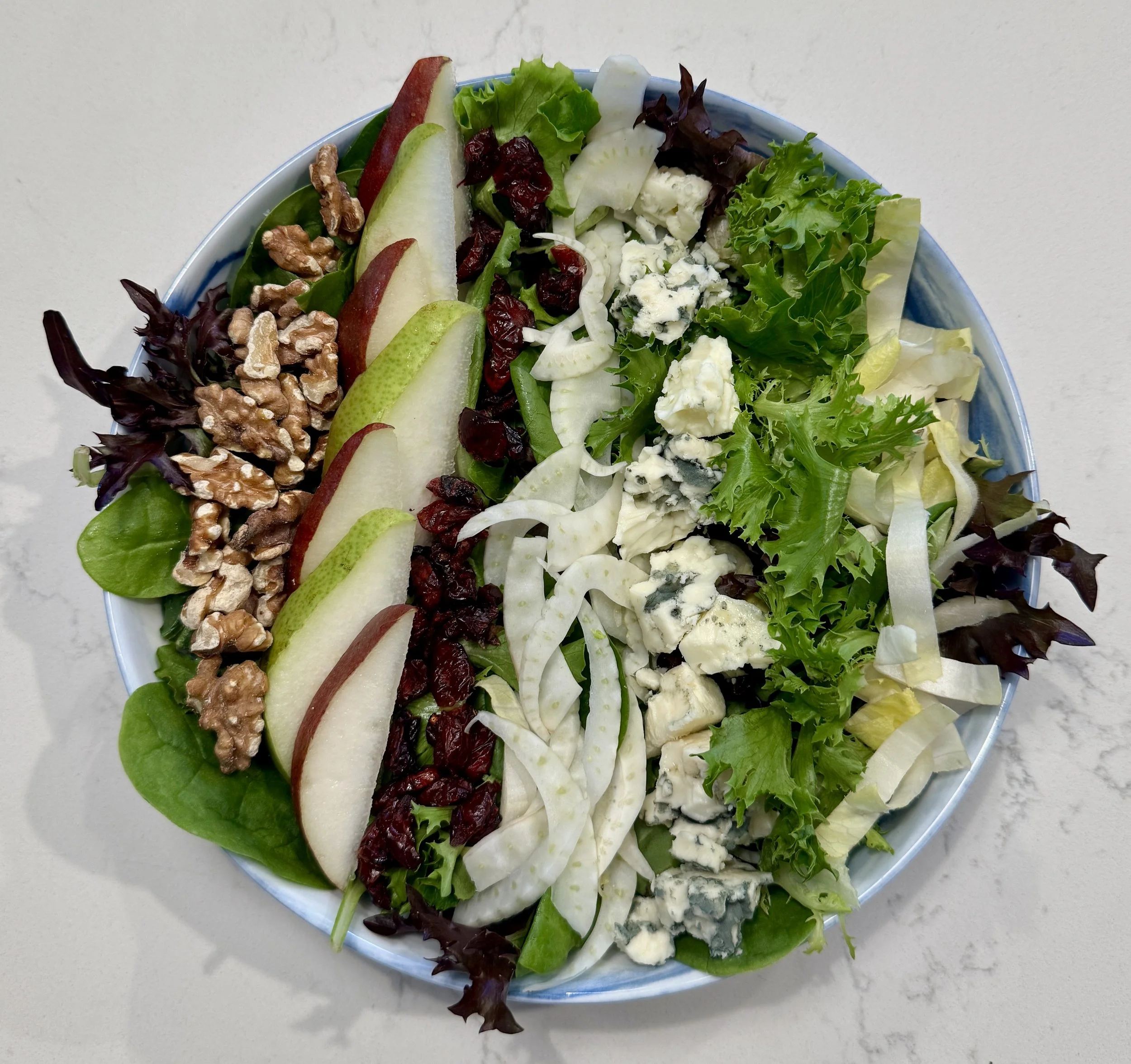 Spring greens, frisee, belgian endive, shaved fennel, sliced pears, blue cheese crumbles, cranberries, toasted walnuts